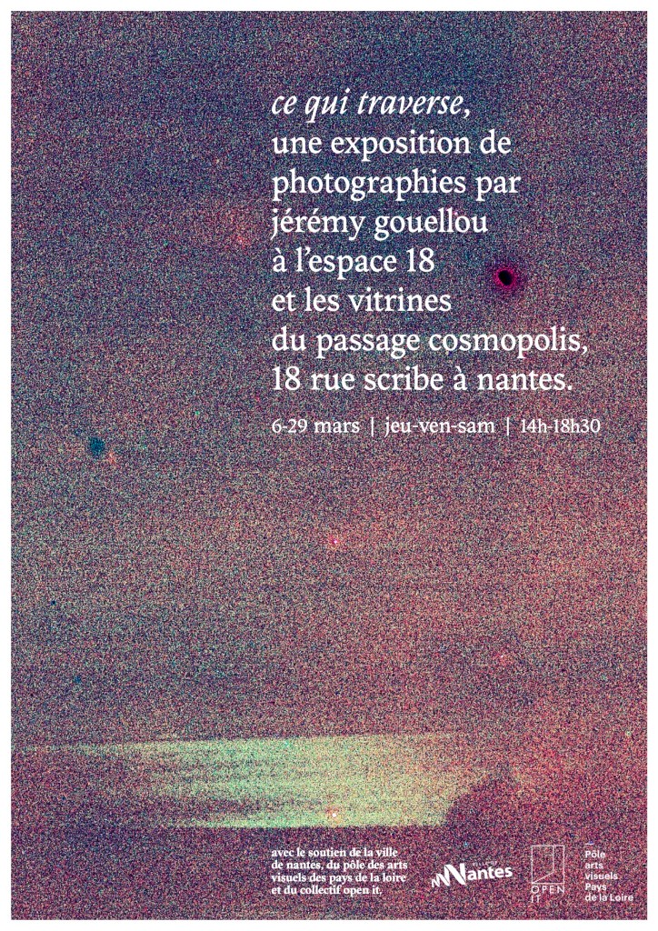 Exposition | Espace 18 x Les vitrines | Passage cosmopolis 18 rue Scribe à Nantes | 6 – 29 mars | Jeudi, vendredi et samedi de 14h à 18h30 | Avec le soutien de la ville de Nantes, du Pôle des Arts Visuels des Pays de La Loire et du collectif Open It