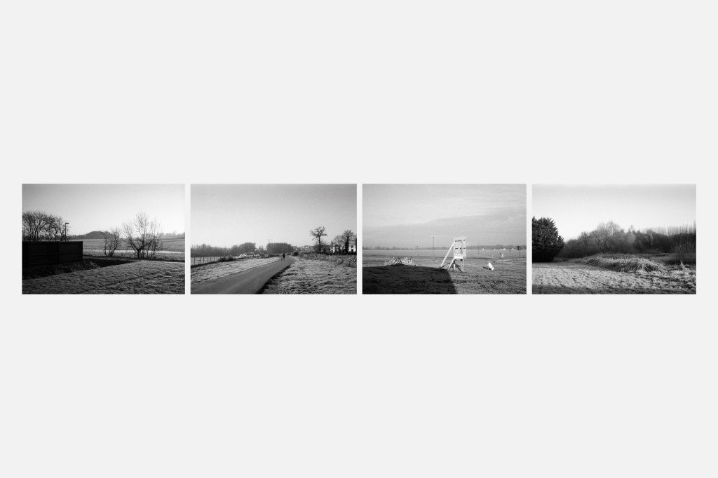 Cette série est tirée d’un même film photographique, exposé un matin de janvier en suivant les contours d’une commune. Ces images ne figent la lisière qu’à un instant : c’est là, aux abords des panneaux de chantier, aux prémices des lotissements, que se joue son identité.